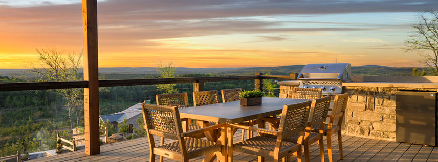 Features a BBQ grill, outdoor dining table, and comfortable lounge seating—all with panoramic views of the surrounding pines